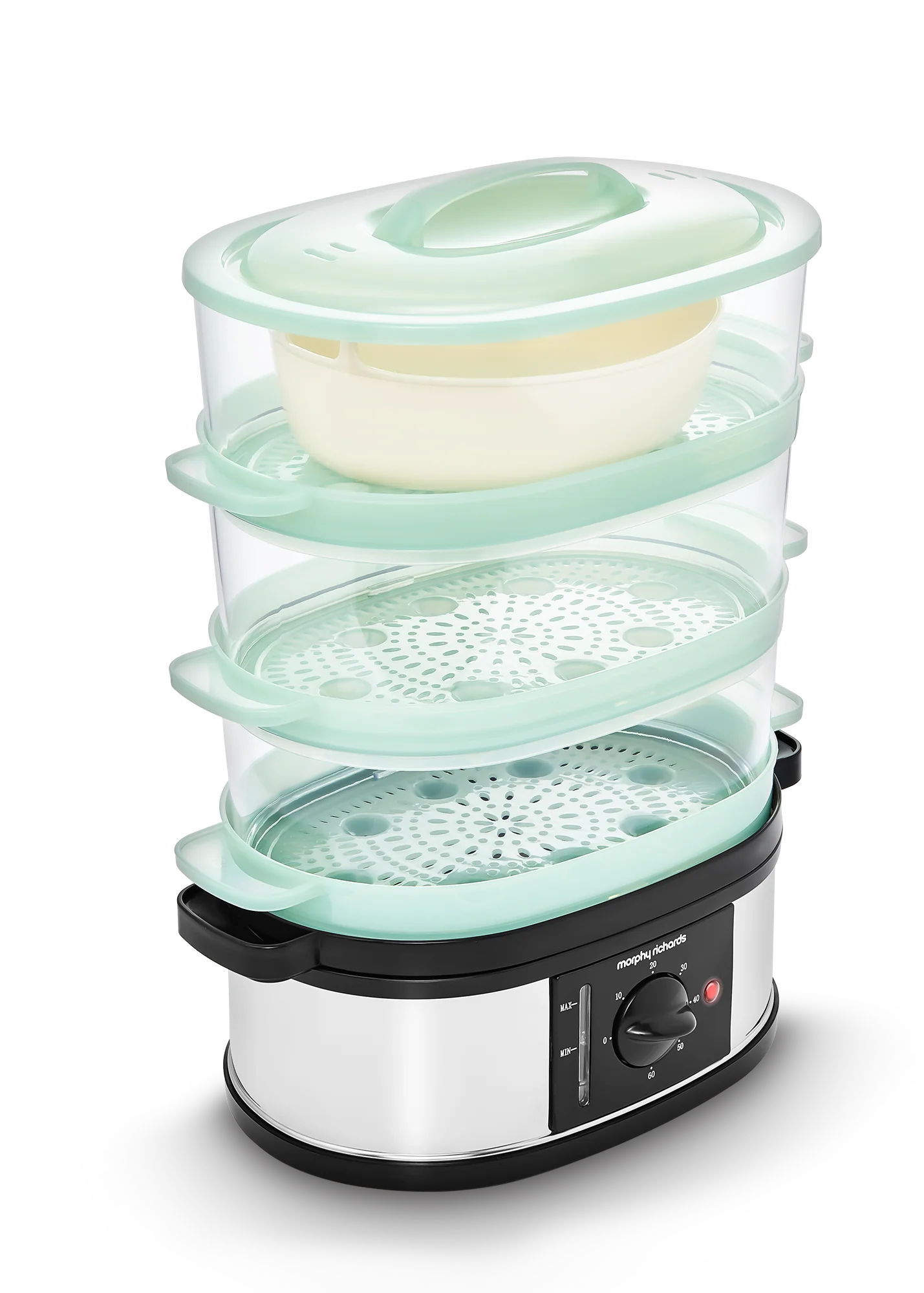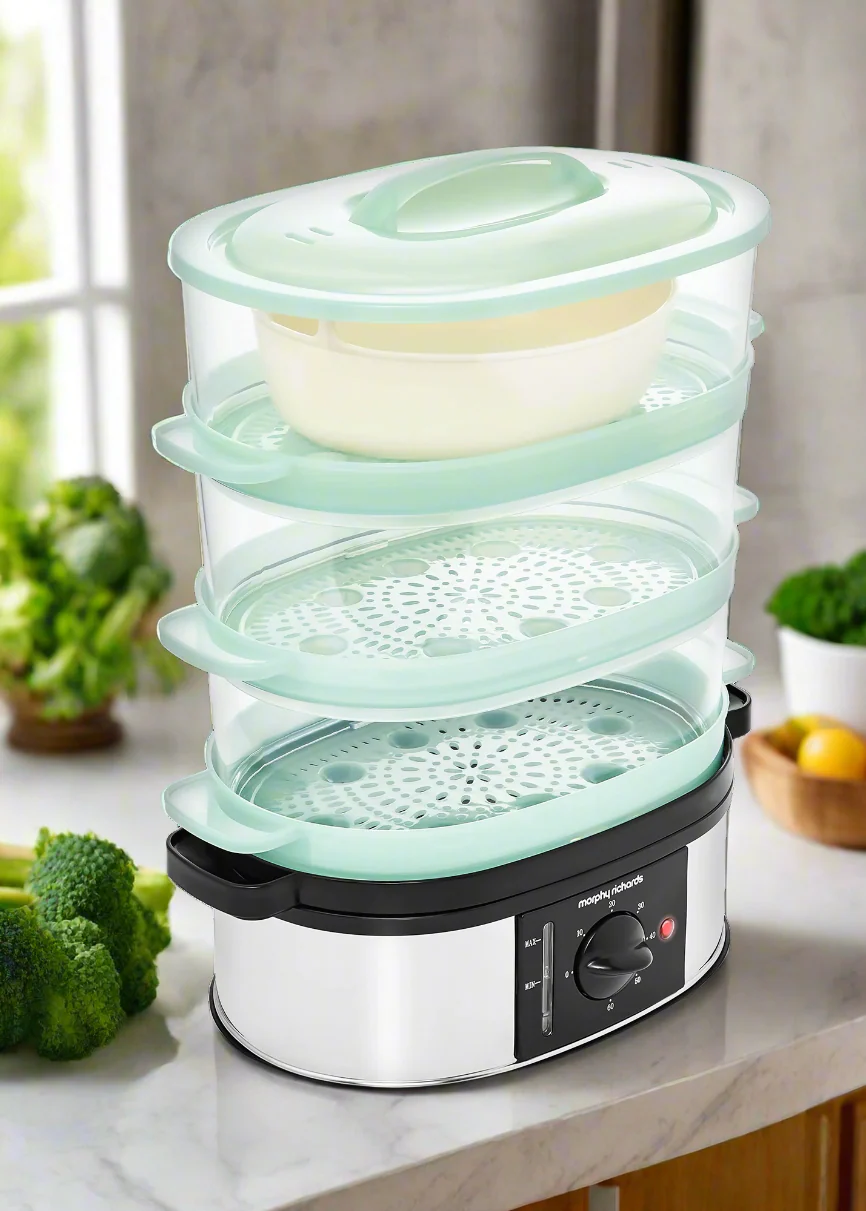 Introducing the 3 Tier Food Steamer, your ideal solution for healthy, tasty meals made quickly and easily., The 9 litre capacity is large enough to cook up a meal for the whole family, and its special features make using it simple and convenient. With an instant steam production, you can start cooking straight away. There's a 60-minute timer along with a bell so you know exactly when your food is done, plus a visible water gauge so you always have an accurate reading of how much liquid is left in the steamer.