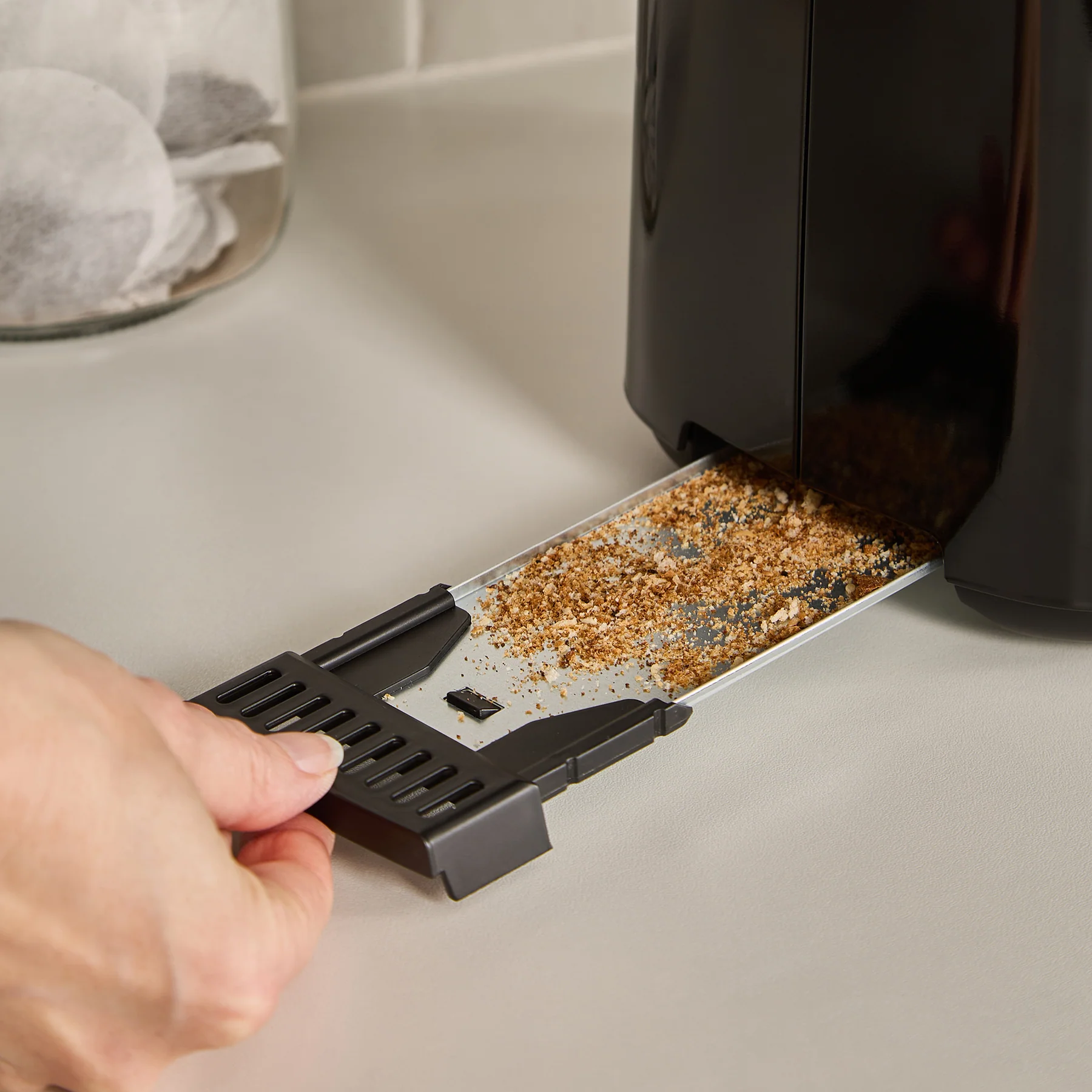 Removable crumb tray, Defrost bread setting, Reheat button, Cancel button, Cord storage, Bread Centralisation Mechanism, Cord Storage