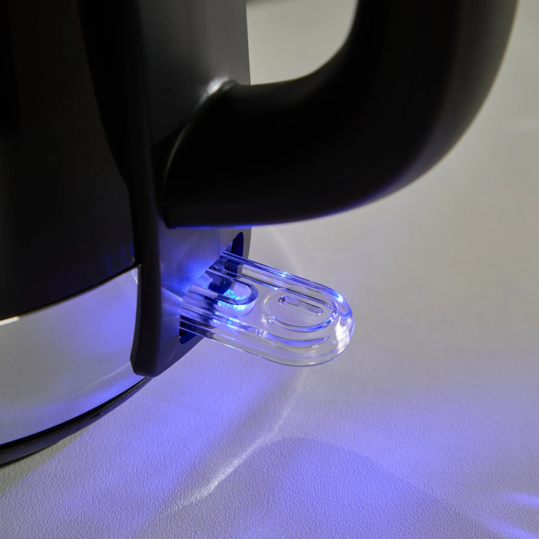 Illumination on/off switch, Concealed Element, Dual Water Window, 360 degree cordless base, Removable limescale filter, Hinged Lid